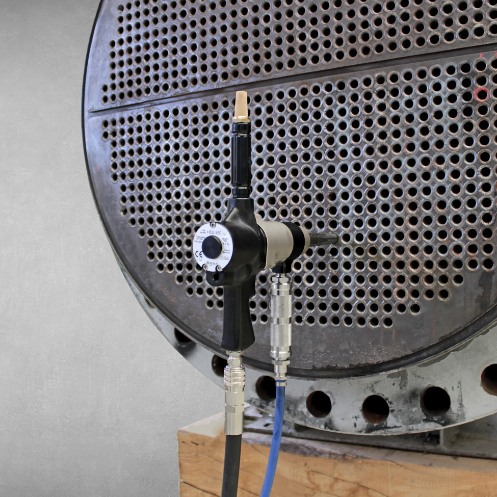 Mechanical internal cleaning with rigid shafts for heat exchanger tubesThe pneumatic cleaners with modular rigid shafts and water cooling of the tool, are the simplest and most effective solution for cleaning double sheet heat exchanger tubes, even if they are completely obstructed.